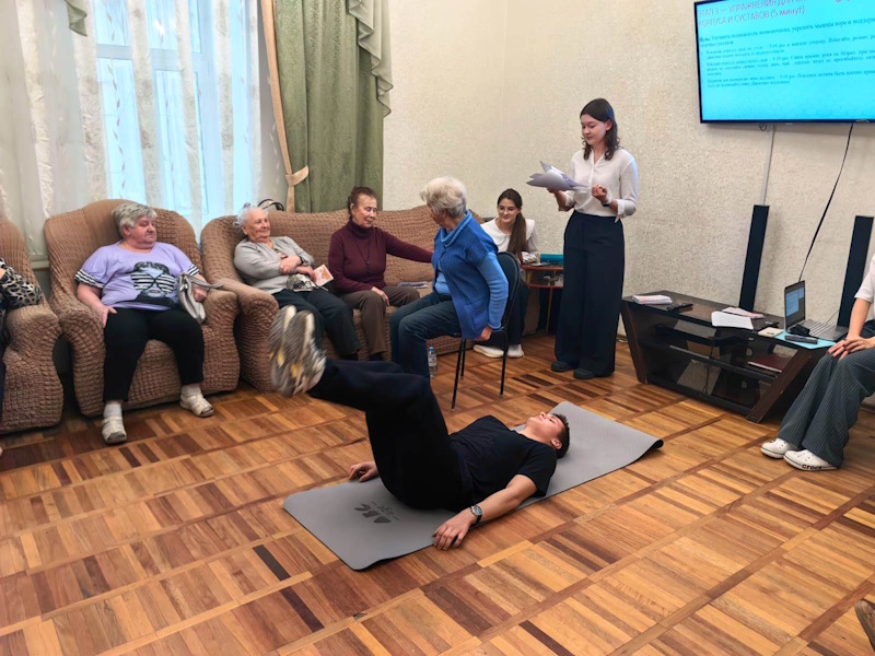 Пенсионеры с интересом выслушали информацию и активно повторяли упражнения вместе со студентами. Это взаимодействие молодого и старшего поколений оказалось не только полезным, но и приятным, подарило положительные эмоции и стало примером плодотворного обмена опытом.