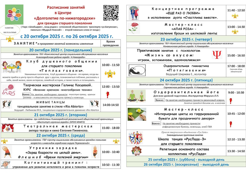 Ознакомьтесь с расписанием занятий в Центре «Долголетие по-нижегородски» с 20 октября по 26 октября 2025 года.